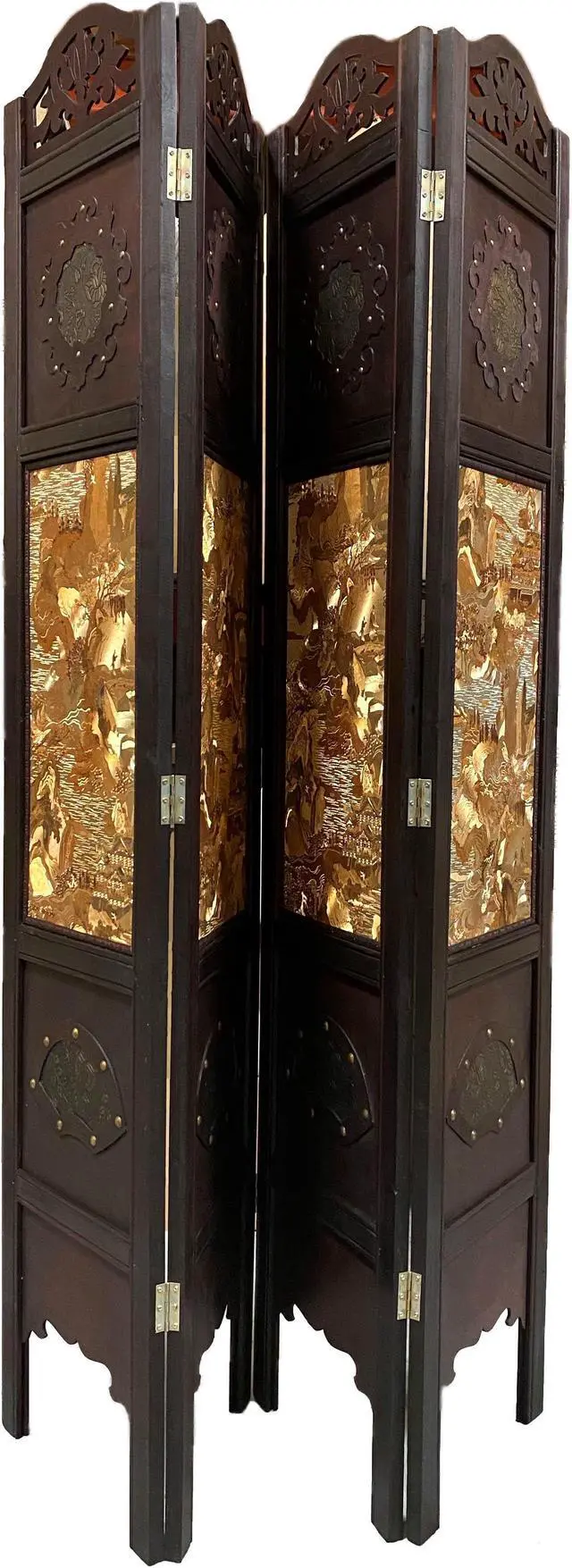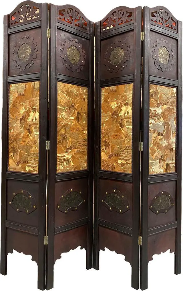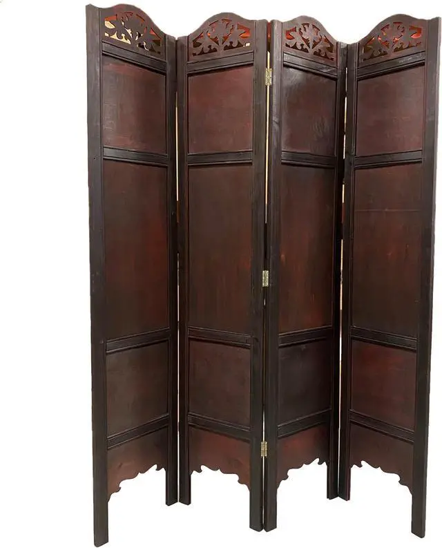 Complete your Oriental accent interior design with this elegant, beautiful four panels screen room divider. It is mahogany teak color Finish, back side is plain painted in the same color. This vintage style wooden screen is sure to become the focal point of any room while providing desired seperation.