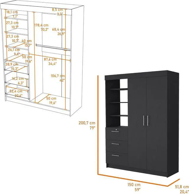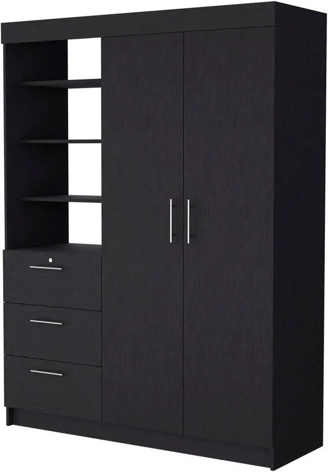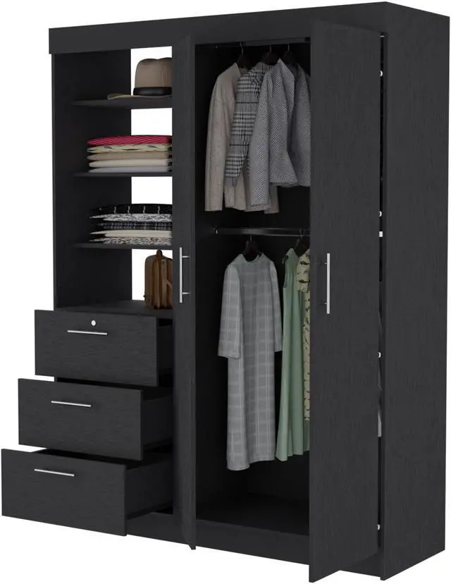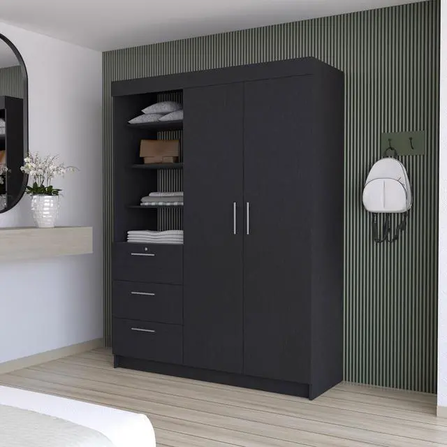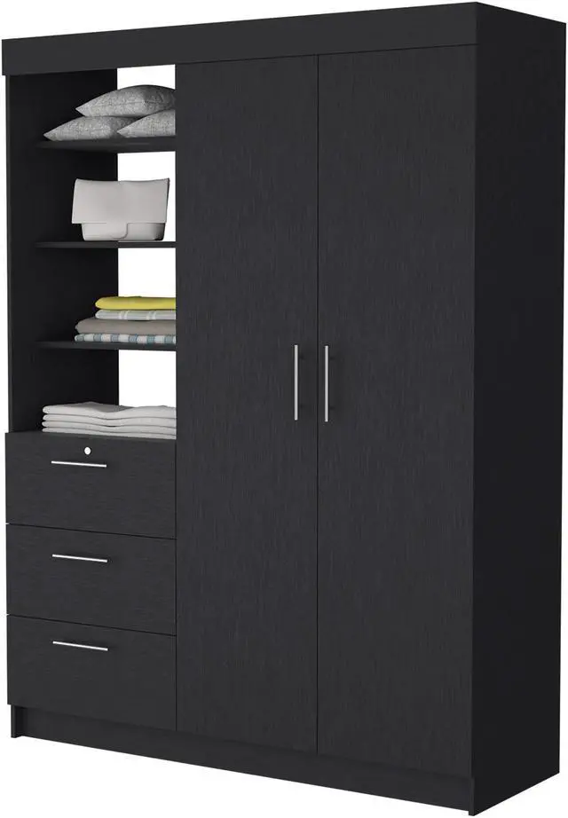 Do you need more closet space but want to maintain your comfort? Tempe has you covered! This armoire offers plenty of storage in a design that won't cramp your style. The two wide doors reveal two hanging rods, perfect for organizing your clothes. You'll also appreciate the three large drawers with metal handles, which offer easy access to your belongings. And if more storage is needed, the three upper shelves provide plenty of additional space. So why wait? Get yourself a Tempe Armoire and enjoy the convenience and comfort of extra closet space today!