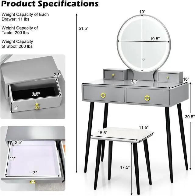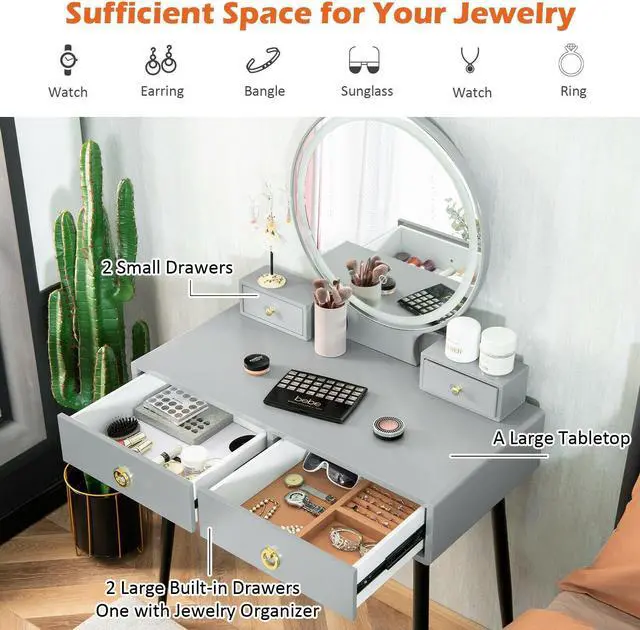 Ample Storage Space for Jewelry: The table features a wide tabletop to allow you place all the necessities you need. 2 storage cases with lining on tabletop can store tiny items such as lipsticks and makeup brushes. The 2 large drawers, one of which has cushion and jewelry organizer, can hold your jewelry, skincare products and other necessities.