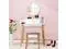 Upgrade your morning routine with this Wooden Makeup Dressing Mirror Table Set with 1 Drawer. Featuring a spacious desktop and a preassembled large capacity drawer, this makeup dresser table helps you to put on makeup easily by finding your cosmetics, jewelries, and hair accessories quickly. The table and stool legs are made of pine, which makes the product stronger and more durable. The mirror can be adjusted in two heights to meet your different needs, and there are two rows of holes beside the table to help you thread the tangled hair-dryer cord. The round knob on the drawer gives a firm grip for easy operation. With its modern and concise style, this dressing table will go really well with the rest of your furniture and become a good decor in your home.
