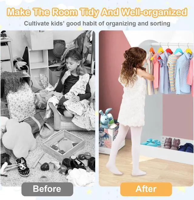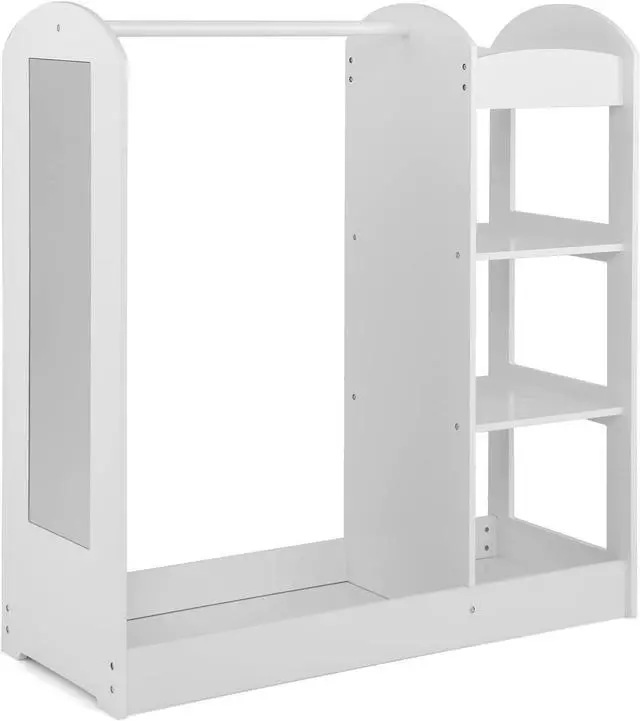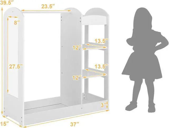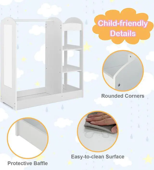 Child-Size Design and Kid-Safe Mirror: This dress-up center is specially designed for kids over 2. With 39.5" reasonable height and open design, this kid's closet allows kids to conveniently store or remove clothes. Besides, exquisite mirror enables kids to better dress up.