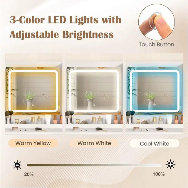 HD LED Lighted Mirror: The lighted mirror features 3-color LED lights with adjustable brightness and a touch button, offering warm yellow, warm white or cool white lighting according to your needs.
