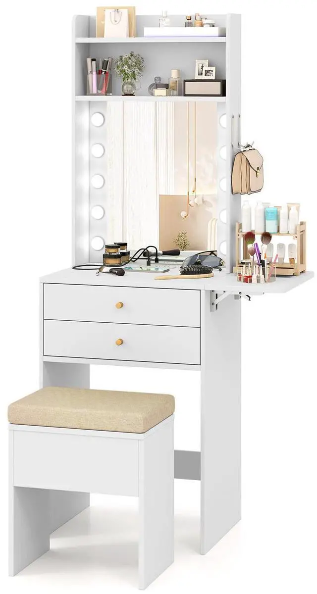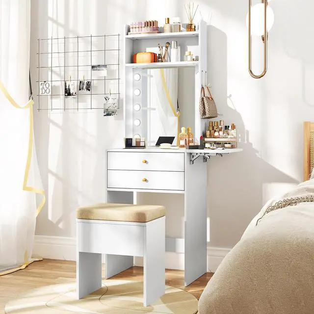 Space-saving Addition: The convenient drop leaf countertop provides extra space for makeup and accessories when expanded. And you can fold it down to save space when you don't need it. Featuring a compact design, this vanity desk and stool set can fit well in any small bedroom.