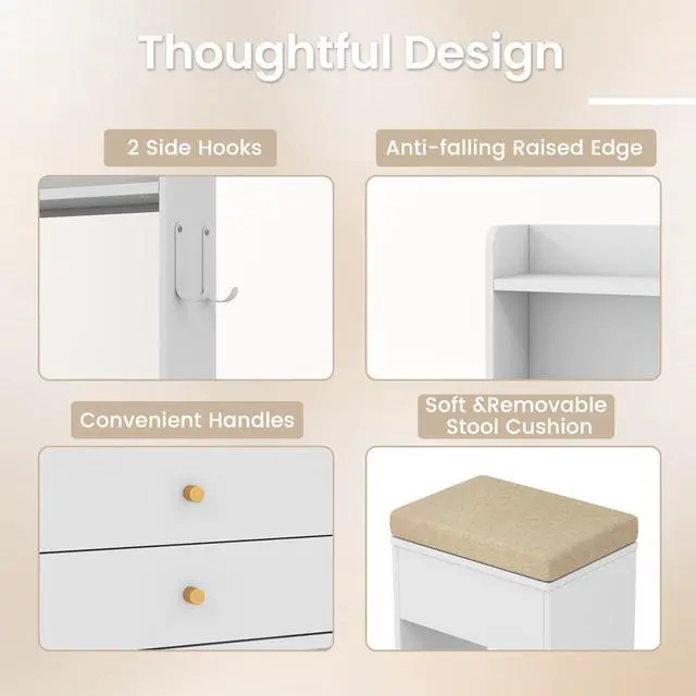 Comfortable and Thoughtful Design: This vanity set includes a cushioned stool that provides optimal comfort while you prepare for the day or a night out. The zippered cushion cover is easy to remove and wash by machine. To enhance stability and security, the vanity desk features an anti-toppling device.