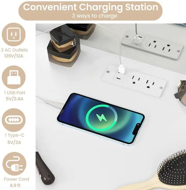 Convenient Charging Station: Built with 2 125V/12A AC outlets, 1 5V/2.4A USB port and 1 5V/3A Type-C interface, this vanity table set offers 3 ways to charge for your beauty tools or other devices. Besides, with a 6cm/2.5" hole at the back, you don't have to worry about messy cords.