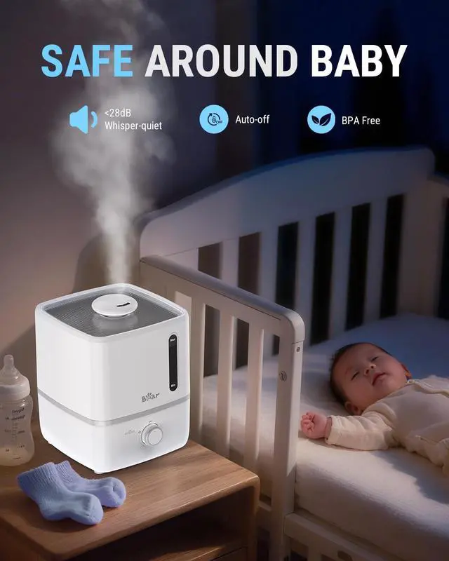 & : Bear humidifier for bedroom is almost noiseless during operation, providing you with a quiet and comfortable environment to rest or study. All night fine mists helps your baby fall asleep faster. BPA-FREE to ensure your family, baby, pets and plants are in good health