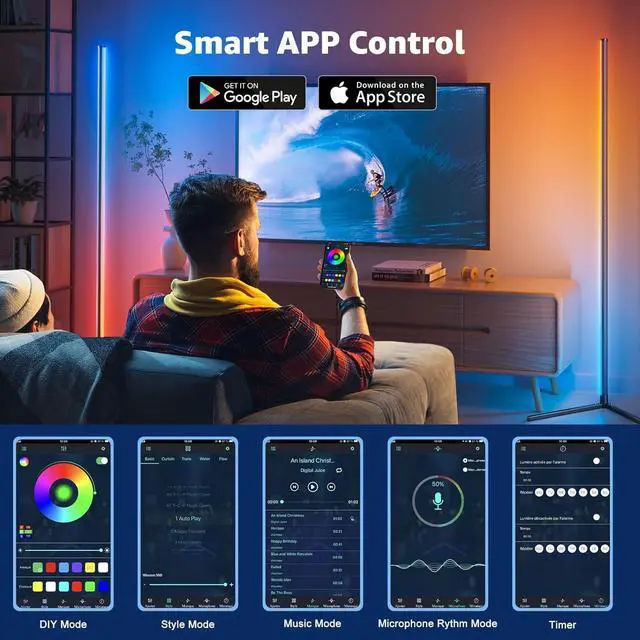 Three Control MethodsRemote controls, app controls and wire switches make it easy to control the led floor lamp. The app allows you to adjust the color, brightness and lighting effects to your liking.