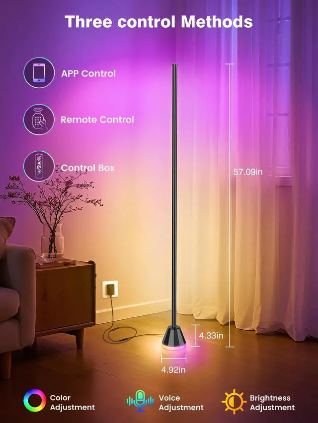Three Control Methods: This corner floor lamp offers multiple control options, including a remote, app, and wired switches, making it easy to adjust colors, brightness, and lighting effects. Whether you want a cozy glow or vibrant ambiance, customization is simple and convenient for any occasion.