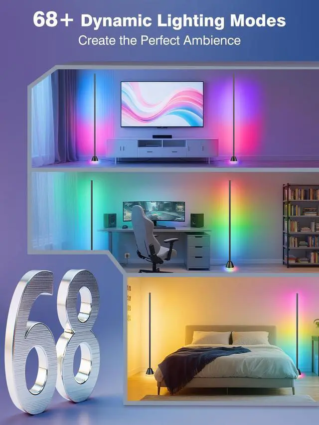 Corner Floor Lamp, LED Corner Lamp with AC Adapter & APP & Remote Control, Modern RGB Floor Lamp with 16 Million Colors, 68+ Scene Modes, Music Sync, Ambient Lighting for Living Room, Bedroom