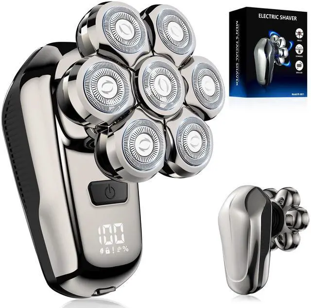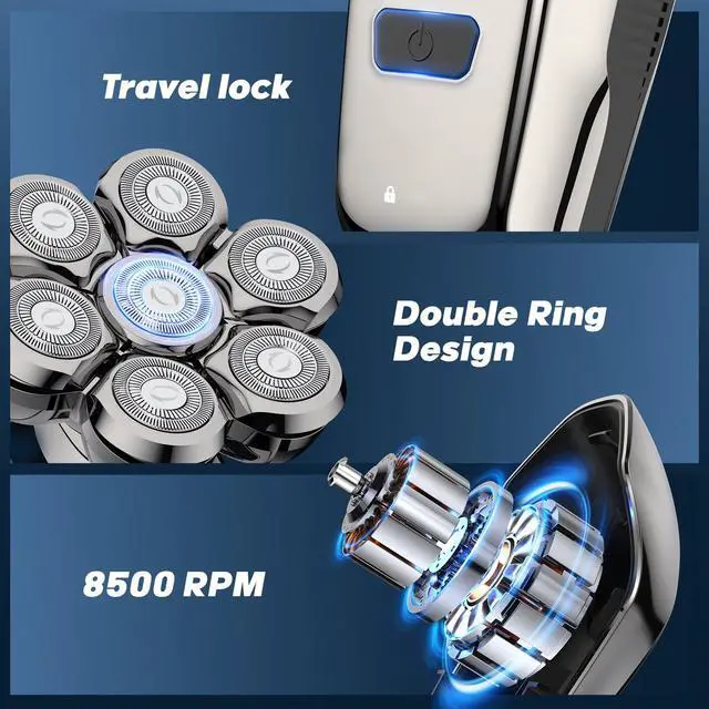 7D Floating Flex Heads: Our electric shaver's 7D floating system glides effortlessly across your scalp, face, neck, and body, adapting to every contour. Ultra-flexible rotating blades maximize coverage while dual-layer steel blades precisely capture hair. Dual mesh grids reduce irritation and prevent pulling for a remarkably smooth shave.