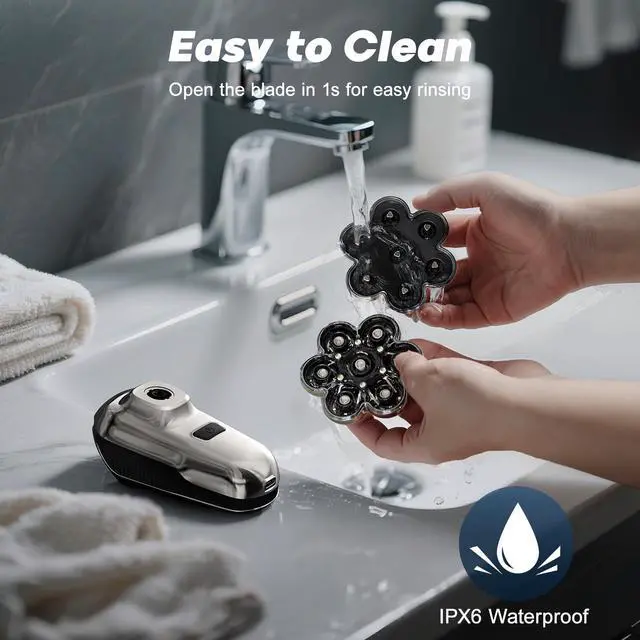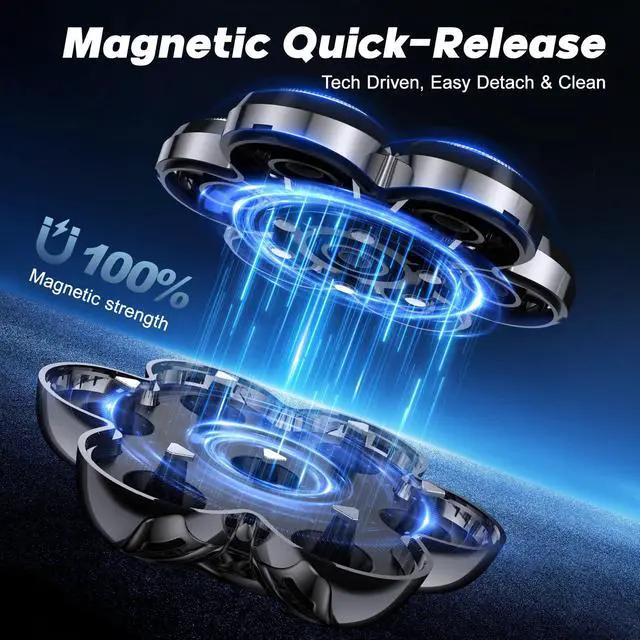 IPX6 Waterproof Rotary Shaver: Designed for versatility, this Bald shaver for men features IPX6 waterproof,allowing both dry shaving and refreshing wet shaving with gels or foams. The upgraded magnetic detachable head makes deep cleaning effortless - simply remove the entire blade unit in one second for rinsing and drying.