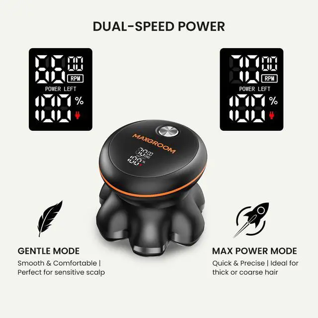 Ultra-Close Shave | 7D Floating Heads: MAXGROOMs upgraded 7D floating heads contour precisely to every curve of the scalp for a true 0.10mm close shave. Each floating module independently flexes to match different hair texturesfine, thick or coarsedelivering a clean, even result with less pressure and fewer passes. The optimized surface contact reduces irritation and eliminates tugging, giving bald men a consistently smoother, polished look every single shave.