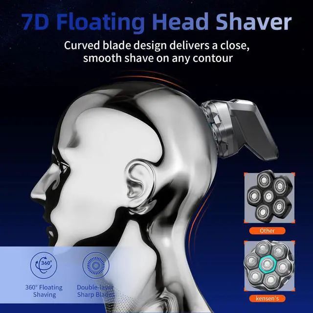 kensen 7D Rotary Head Shaver—Designed specifically for bald heads.No more pulling hair, no more missed spots. Its 7D floating heads effortlessly contour to the natural curves of your scalp, delivering a close, seamless shave that adapts to every contour.