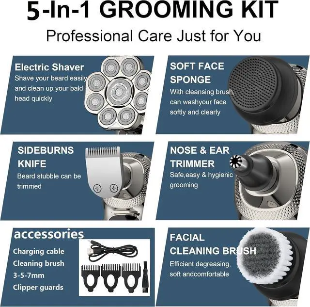 2025 New 9D Head Shavers for Bald Men, 5-in-1 Electric Razor Bawldy 9.0 Floating Pro Ultra Groomie Shaver IPX6 Waterproof with LCD Display Type-C Rechargeable Wet Dry Use Grooming Kit