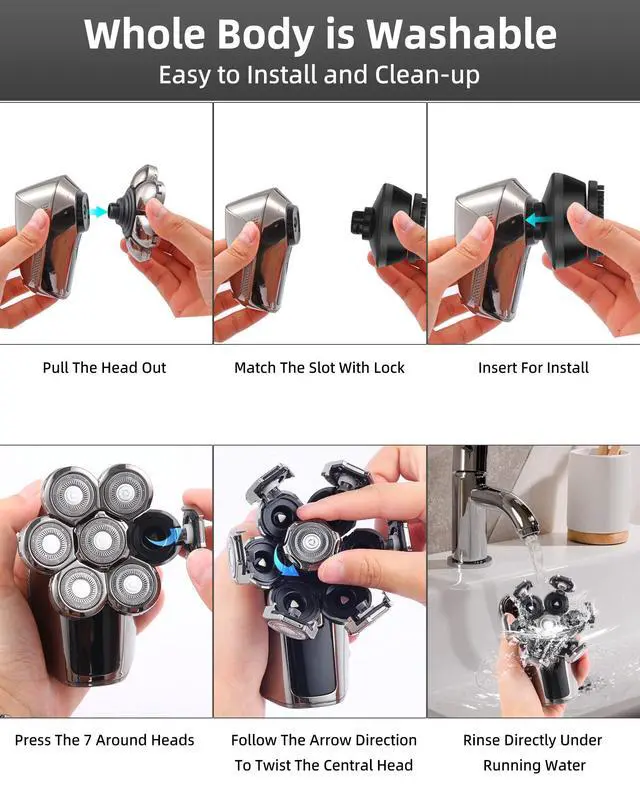 Effortless WashabilityElectric head shaver is easy to clean, the head is detachable, each blade can be rinsed directly under the tap after opening, making it easy to clean.Cleaning all residual hair after each shave to keep the razor in top condition
