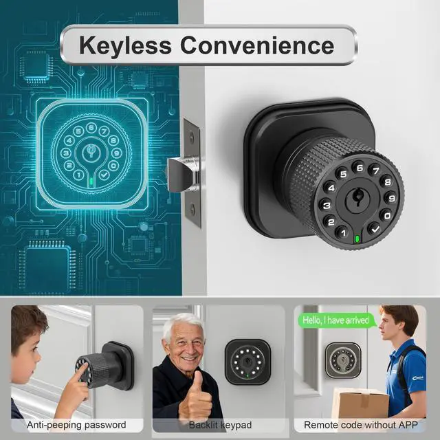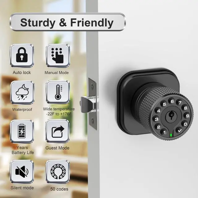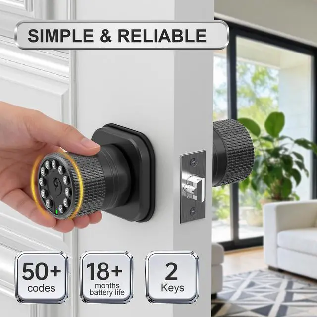 [Keyless Convenience & Stylish Design] This electronic keypad door knob lock allows you to assign up to 50 customizable codes (1-15 digits each) for family, friends, or guests, offering key-free entry. Its ergonomic design features a perfectly sized knob with a detachable silicone grip for a snug, comfortable hold. The stylish look adds a modern touch to both residential and commercial exterior and interior doors, suitable for bedroom, front entry.