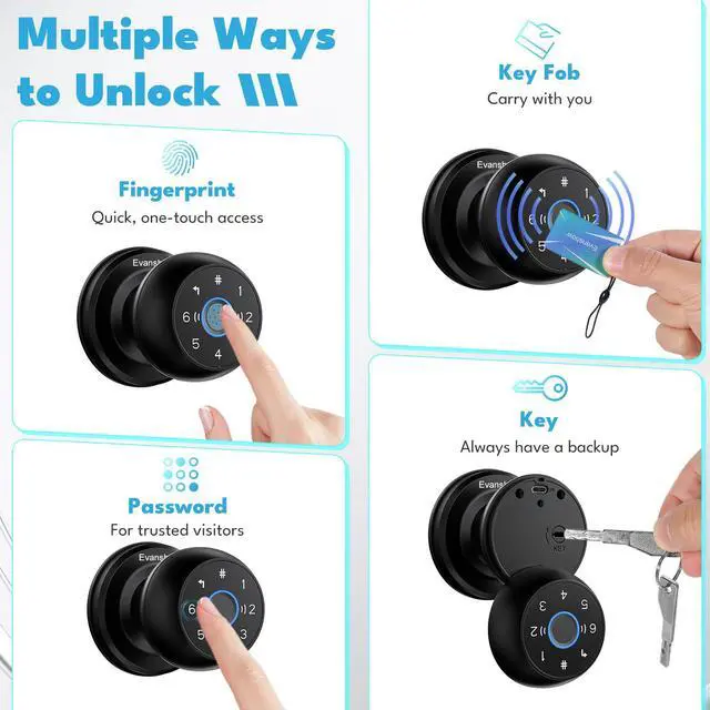 Upgraded Door Lock: Evanshow smart door lock provides add up to 300 users, 100 fingerprints and 100 passwords to suit different family members and guests