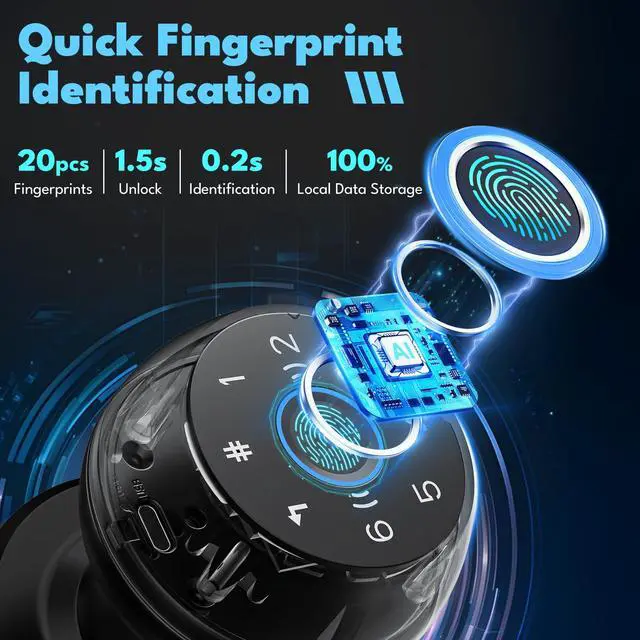 Biometric Door Lock & Auto-Lock: The thumbprint door knob uses advanced biometric tech for 0.5-second unlocks; Door Locks for Bedrooms with the auto-lock function, it automatically secures itself after a pre-set time