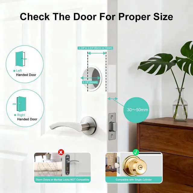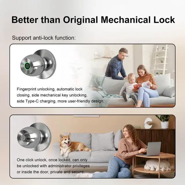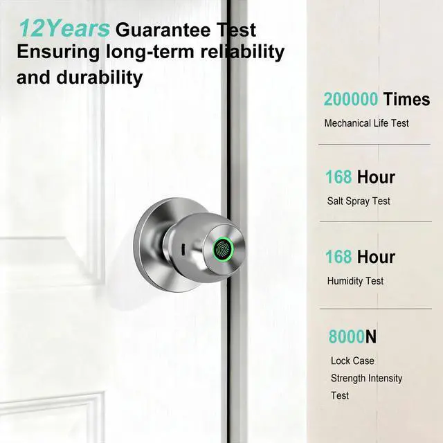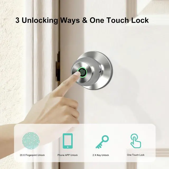 3 Unlock Ways & One Touch Lock52HZ fingerprint door knob with lock offers 3 unlocking options: fingerprint recognition (20 fingerprints), app control (remote within Bluetooth range), and mechanical keys for emergencies, locks automatically upon closing. This fingerprint door lock provides fast and secure keyless entry for your family, visitors, and apartment tenants, giving you peace of mind when you're away.