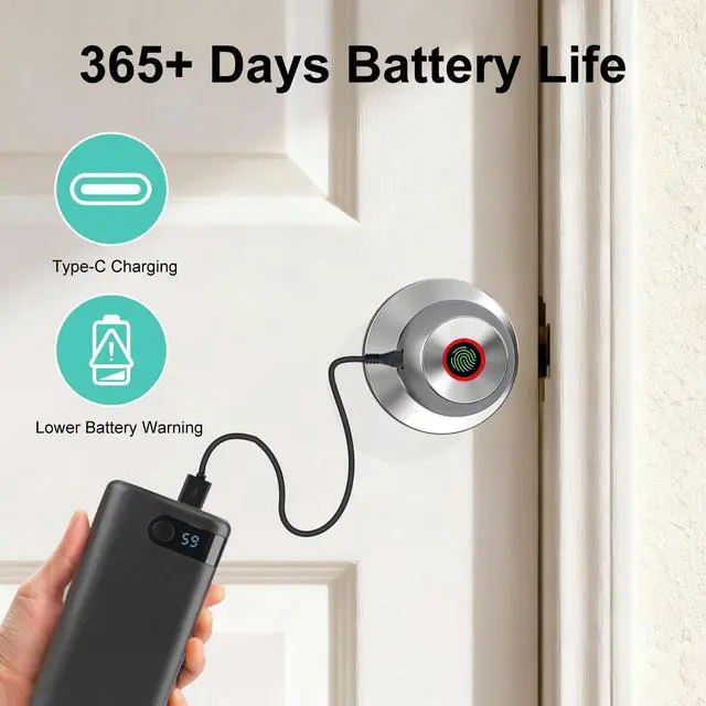 One-touch deadbolt & Long-Lasting BatteryThis smart fingerprint door lock features a one-touch deadbolt function. Once locked, it can only be opened with administrator privileges or unlocked from the inside. You can customize a silent mode to enjoy undisturbed sleep, creating an absolutely private and secure home environment for you and your family. The bedroom door lock designed with low power consumption, this bedroom smart door lock lasts 6-8 months with 20-30 daily door openings, eliminating the hassle of frequent charging.