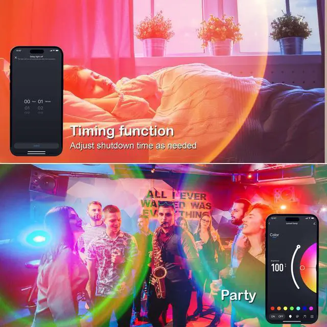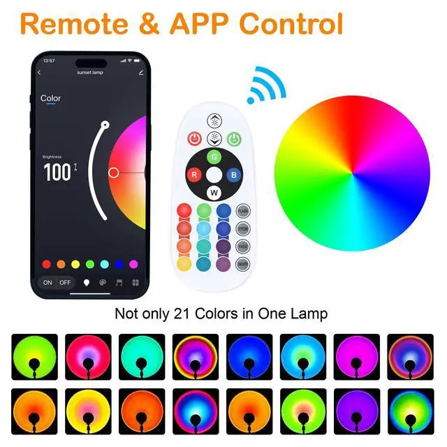 APP& Remote Control Choose from over 21 colors and 4 dynamic modes via a switch button or the app, meeting the different lighting needs of users in various scenes. Adjusting the sunset projector lamp through the app for access to advanced modes such as unlimited RGB color options, dynamic modes, music, microphone, and timer modes, etc. Make your party atmosphere more exciting!