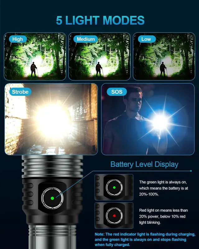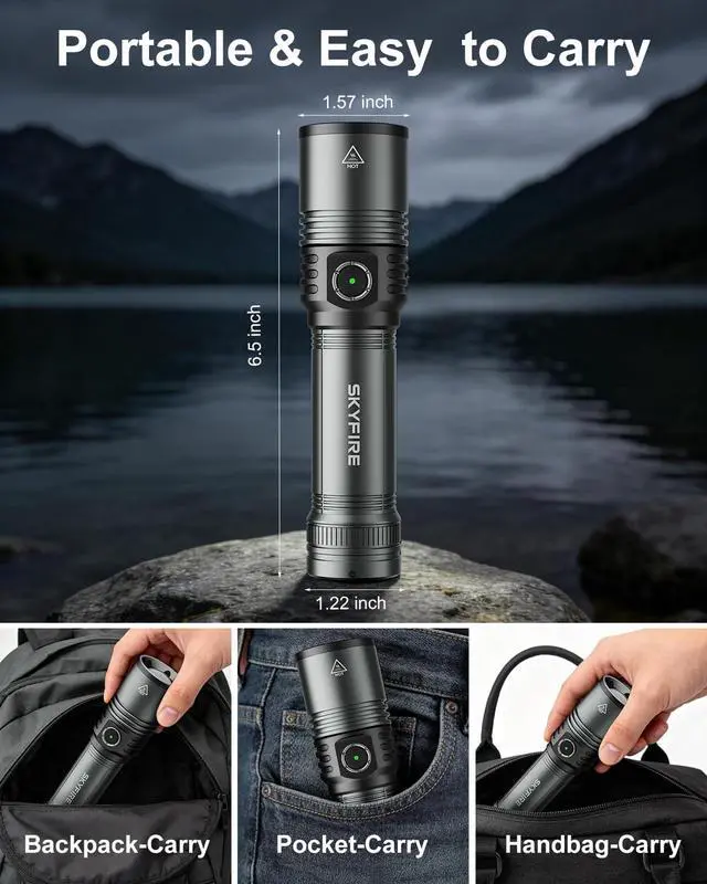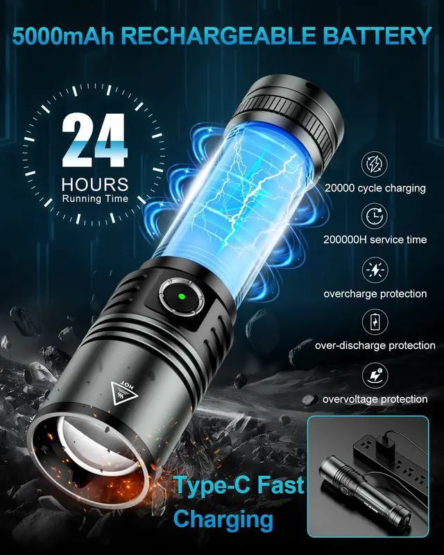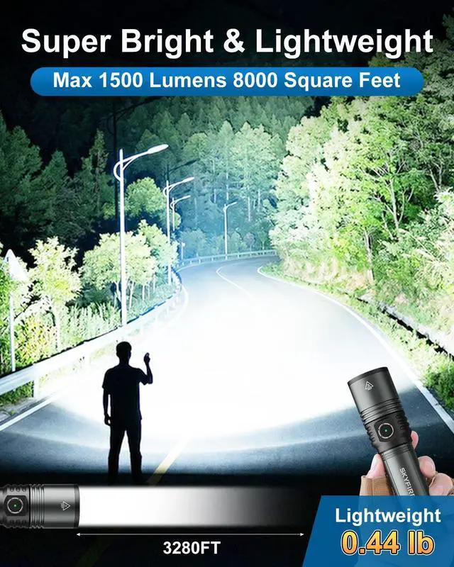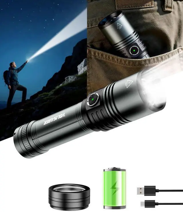 Max 1500-lumens tactical flashlight zooms to 3280 Feet. Built-in USB-C battery lasts 10hrs (High)/24hrs (Low). Ideal for camping, emergencies, repairs.