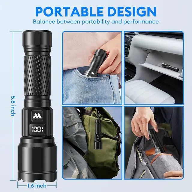 [LCD Power Indicator & Long-Lasting Runtime]: Battery included and never guess the battery life again. The built-in LCD screen display clearly shows the exact remaining battery life. This rechargeable flashlight runs up to 15 hours and fully charges in just 2 hours via USB. It's the reliable, long-lasting light source you need for power outages, extended camping trips, hiking, or any situation where knowing your power is critical. WdtPro flashlight has a 100,000-hour lifespan, equivalent to saving 50,000 disposable batteries. Not only saves money but also saves the environment.