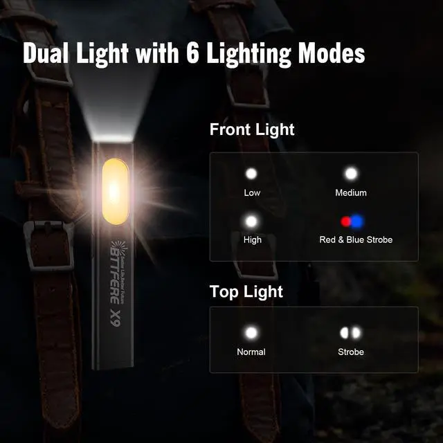 Dual Light + Magnetic Versatility675 lumen dual light (front + top) offers 4+2 modes for precision tasks or area lighting. Magnetic base secures to metal surfaces (e.g., cars, tools, rack), while the clip attaches to gear for hands-free useideal for DIY projects, nighttime repairs, or emergencies. Combines portability with multi-scene adaptability.