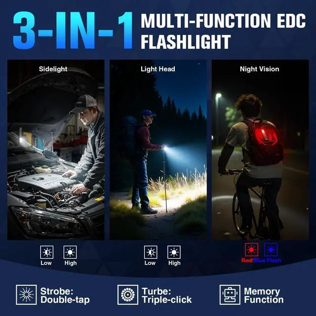 Multi-Function: This powerful rechargeable flashlight combines a front light (high/low/strobe) and a multi-functional side light (high/low/turbo) with a red LED for night vision and red/blue strobe modes. The versatile portable flashlight delivers precise illumination with streamlined gearideal as an EDC flashlight for daily carry. Great flashlights for home, emergencies, outdoor adventures, repairs, and beyond