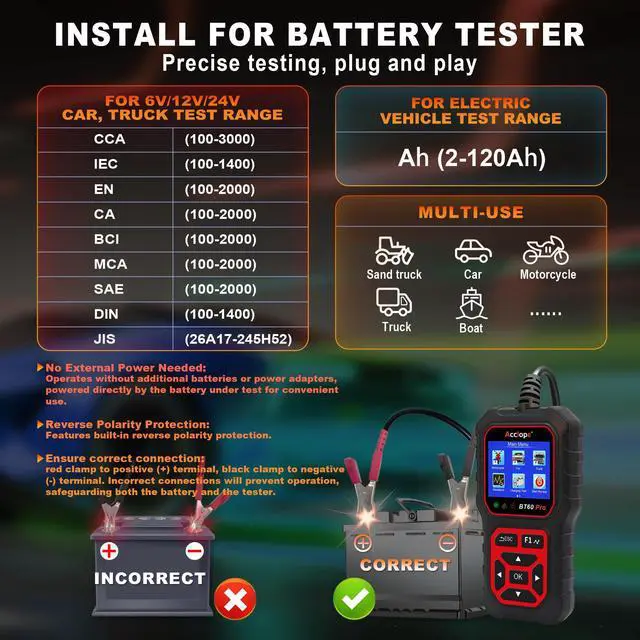 Acclope BT60 Pro offers advanced battery testing, reverse polarity protection, and non-destructive testing. Its high-contrast LCD ensures clear visibility, even in bright sunlight, making it reliable for all environments.