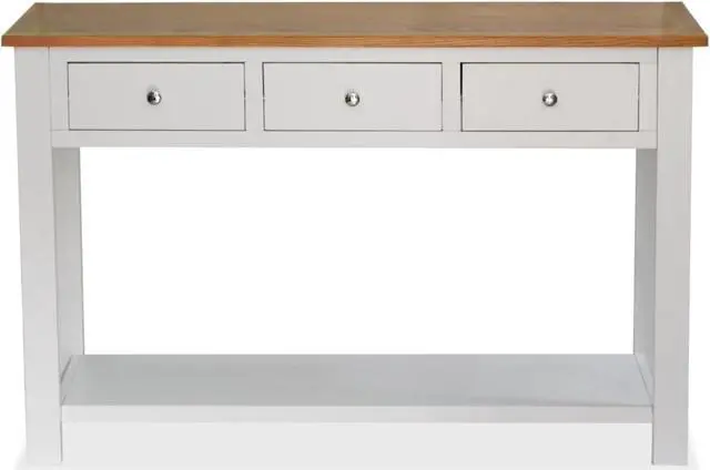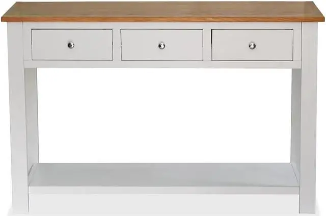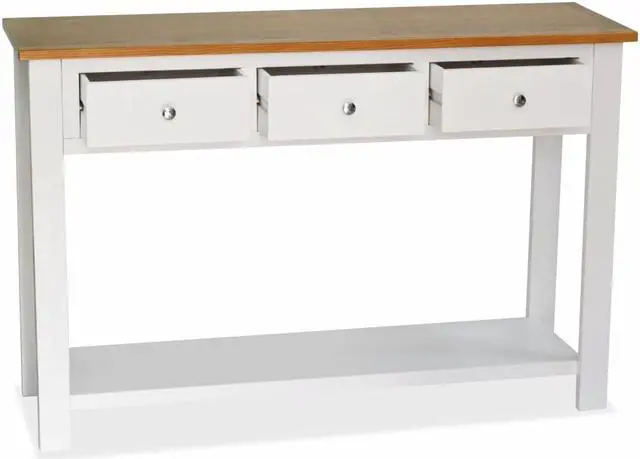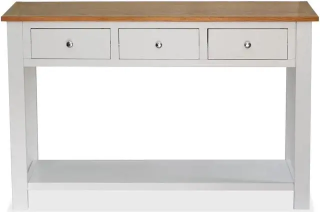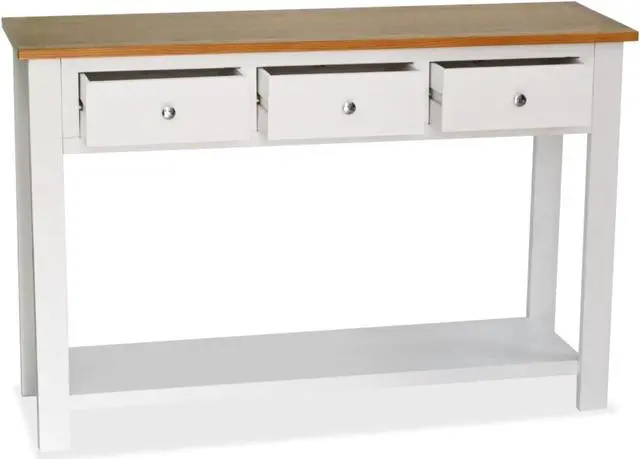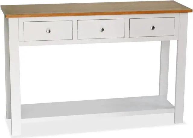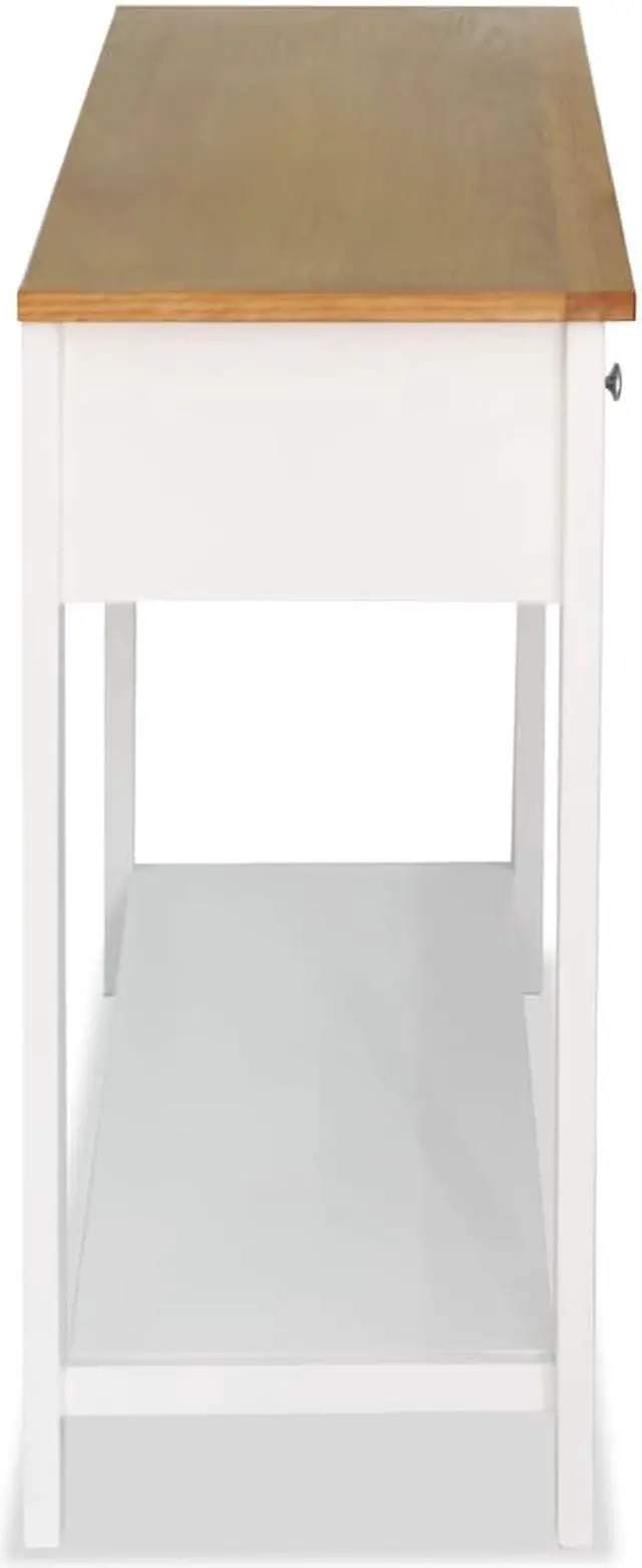 Our two-tone wooden console table will add a touch of elegance to your home decor with its timeless design. The table has a solid oak top, which adds to its sturdiness and durability. The oak has beautiful wood grains that give the piece of furniture a natural charm. The frame, made of solid pinewood with a white finish, gives it its contemporary style. This console table will blend into any interior thanks to its elegant look. This product needs assembly.