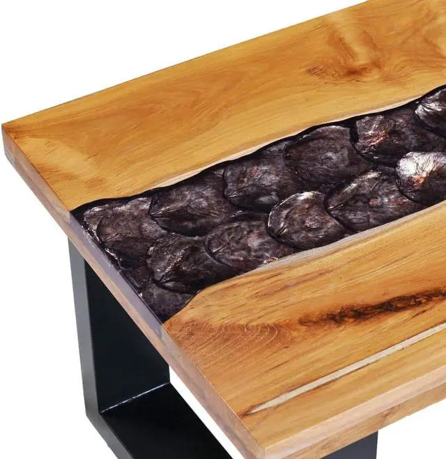 This unique coffee table, made of solid teak wood and broken shell decoration, exudes a rustic charm and is a real eye-catcher. Its rectangular tabletop provides a stable and secure surface on which you can place your drinks, vases, fruit bowls or ornaments. The coffee table can also be used as a side table. The tabletop is fully handmade and the craftsmanship adds to its luxurious appearance. Constructed from extremely durable teak hard wood, this piece of teak table has been seasoned, kiln dried and then fine sanded to give a very smooth appearance.