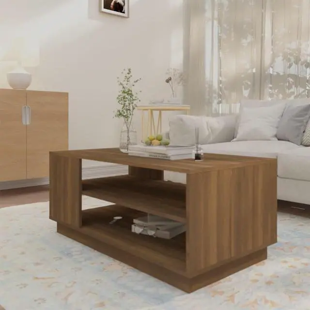 This coffee table featuring a modern design is practical furniture for your living space. The construction of this couch table ensures its sturdiness, durability and long-lasting service. Thanks to the shelves, this living room table provides ample storage space. The sturdy tabletop is perfect for placing your drinks, food and other decorative items. Additionally, the center table is easy to clean with a damp cloth.