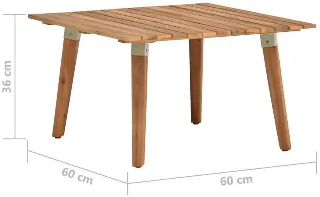 vidaXL Garden Coffee Table 23.6"x23.6"x14.2" Solid Acacia Wood - 46468, Looking for something more refined and compelling in your outdoor space? This wooden coffee table fulfils with solid acacia wood is an optimal choice for you. This table is made of solid acacia wood with natural oil finish for maximum durability, which is suitable for patio, garden, deck, poolside or any outdoor areas. Acacia wood is a tropical hardwood, which is weather resistant and durable. Every step of the process is carried out with the greatest care, be it polishing, painting or lacquering. The craftsmanship and the beautiful wood grains make every piece of furniture unique and slightly different from the next. Additionally, the sturdy tabletop with slatted design offers you space to put some snacks, fruit baskets, decorative items, as well as various other essentials. The coffee table is easy to assemble.