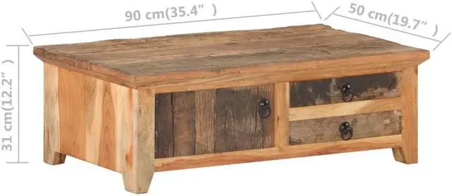 This wooden coffee table adds a vintage look and is a perfect choice for your existing living space. This accent table is handmade from solid reclaimed wood, which means every piece of furniture is unique and slightly different from the next. Reclaimed wood is solid, stable, durable, and beautiful. Signs of wear and visible grain structure give each piece its own history and a unique look. The solid acacia wood frame offers extra stability for the table. It also features one door and two drawers providing ample storage space to keep your item organized and within reach.