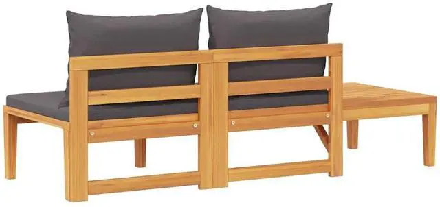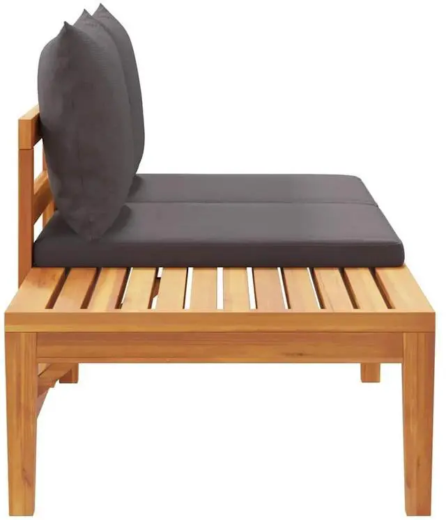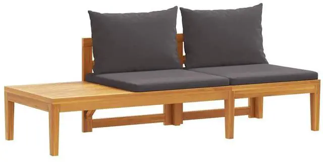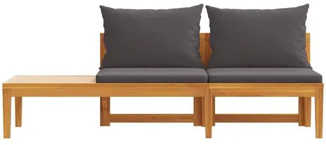 Enjoy a cosy leisure time with your friends or family in the outdoor space on this wooden patio bench with table! This garden bench is made of solid acacia wood, a hardwood with dense grains. This beautifully-designed outdoor bench is stable, durable and eye-catching. Additionally, the exquisite craftsmanship and beautiful wood grains make every piece slightly different from the next. The included cushions add more comfort while resting. In addition, the table can be assembled both on the left or right side according to your demands.