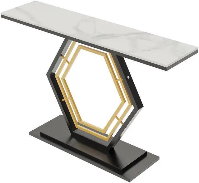 Luxury console tableA luxurious and practical slate table: the pentagonal geometric design bracket acts as a bridge connecting the tabletop and the ground, with a beautiful and sturdy design, the black and gold thickened nano-painted metal bracket adds luxury to the table, and the overall exudes a three-dimensional aesthetic feeling of symmetrical structure