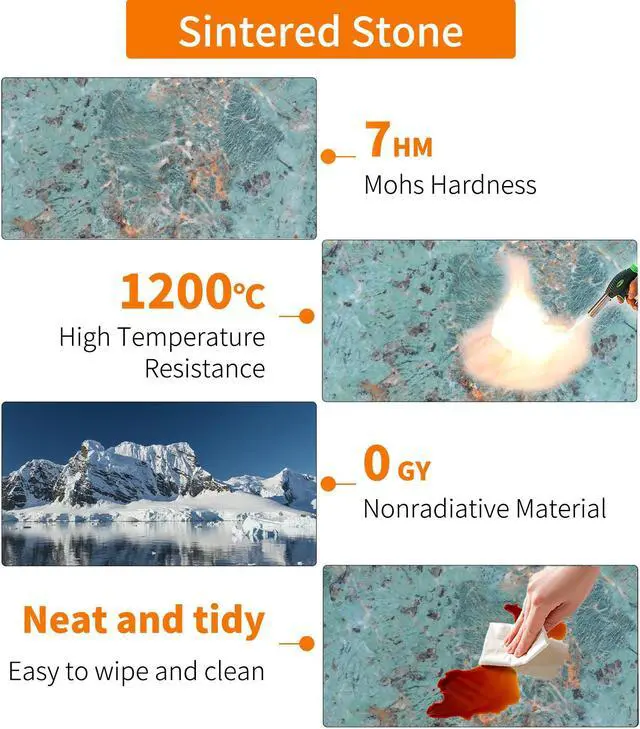 -The desktop is made of high-temperature fired sintered stone material , which is scratch resistant, wear-resistant, high-temperature resistant, and easy to clean. Compared with MDF, sintered stones have high scratch resistance, water resistance and durability, In addition, sintered stones is water-proof as well, preventing it from absorbing spills and spoiling its integrity and look. Strong and wear resistant coated metal frame, the solid metal structure ensures strength and stability,enriched corners,round and natural in case of hurting you, round shape fits all types of corners of sofa side, bed side