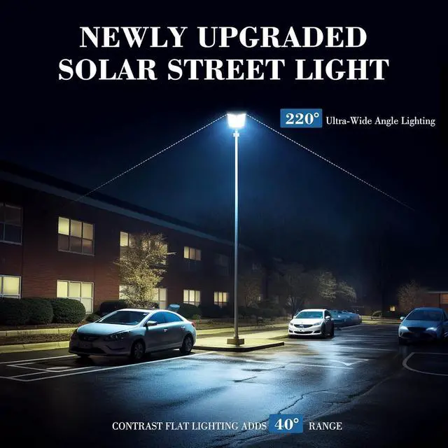 INTEGRATED 220° WIDE ANGLE: solar parking lot lights is a commercial street light with double-sided multi-array design, High brightness new upgrade, Contrast flat lighting adds 40° range, Brightness increased by 80%.