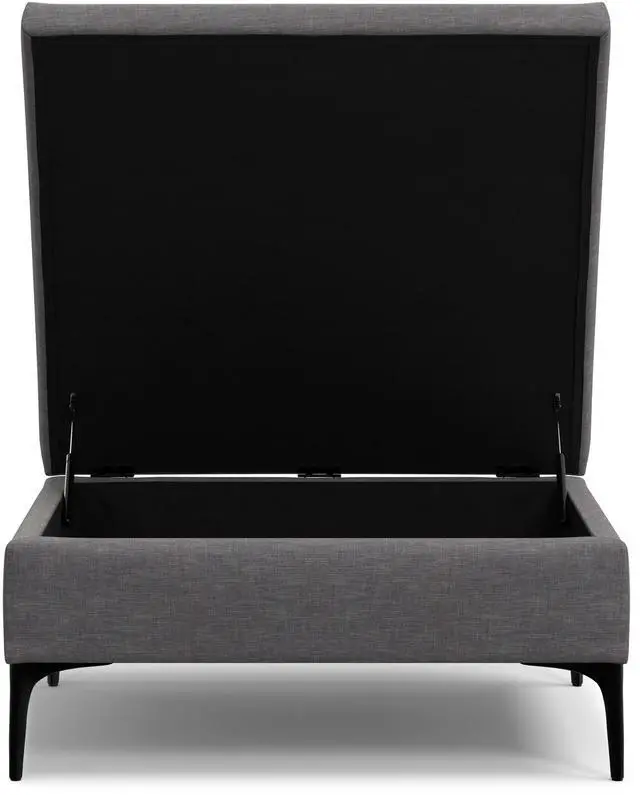 Features a lift-up lid with hydraulic, child safety hinges that opens to reveal a large interior storage space.
