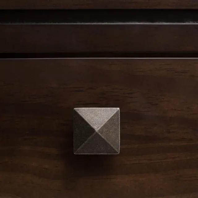 Contemporary design inclludes floating square edged top, square knobs with peaked top and Bronze finish and square tapered legs