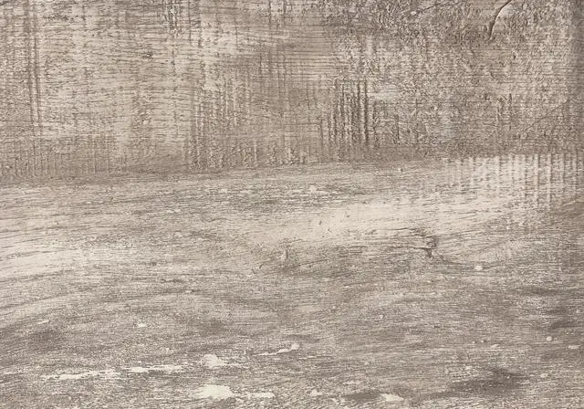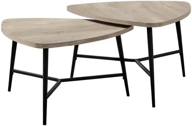 A warm taupe reclaimed wood look finish on the triangle shaped laminate tops, supported by sturdy black metal tripod style legs