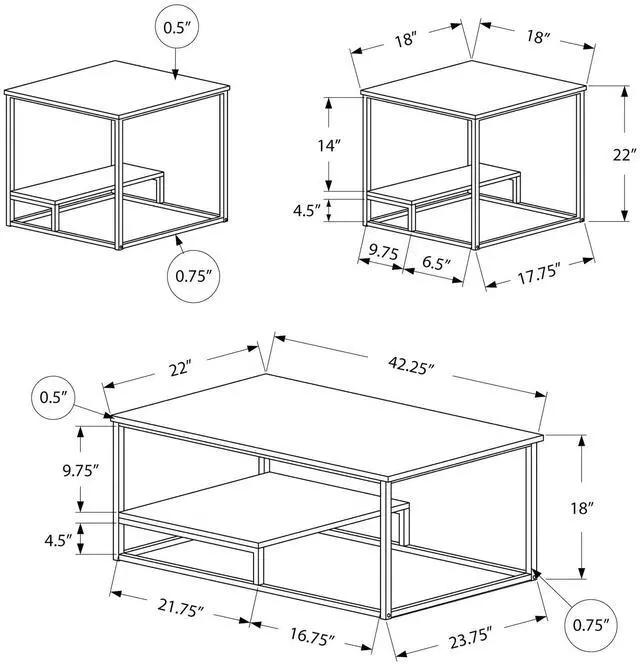 Product dimensions (Coffee table): 42.25"L x 22"D x 18"H;