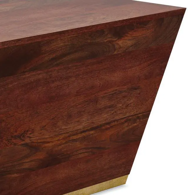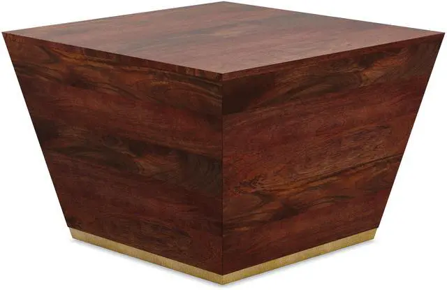 Features spacious square table top with tapered angle base and brass accent trim at table base