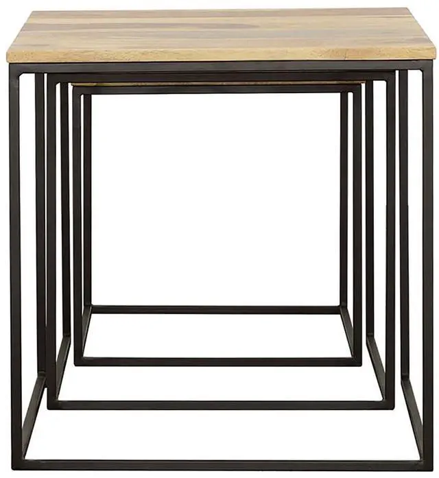 Supported by slim legs made of black metal, which provide stability while complementing the natural wood tops for an industrial-rustic fusion