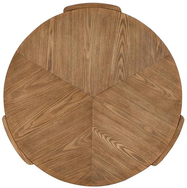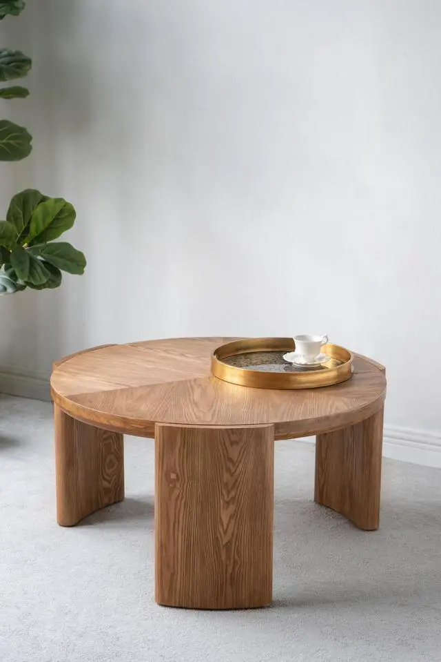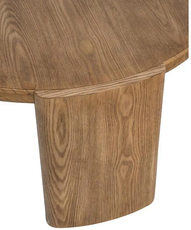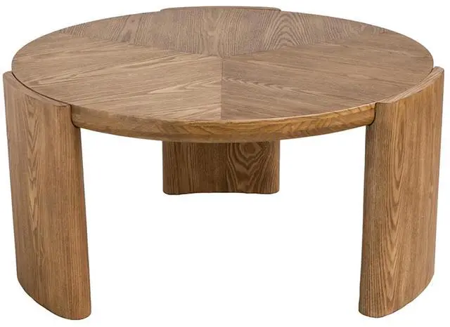Drawing inspiration from classic architecture, this coffee table features a spacious round top, three sculptural legs, and a warm brown ash veneer finish.
