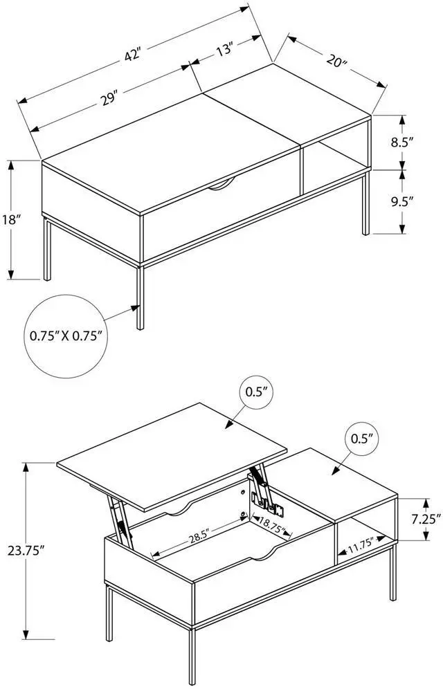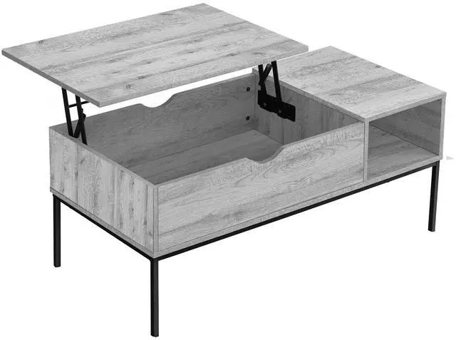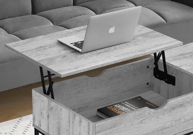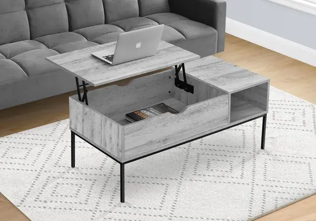 This contemporary style, 42" long rectangular coffee table with storage, a wood-look laminate grey finish on all sides and a sleek black metal base will be a modern standout in your living space.