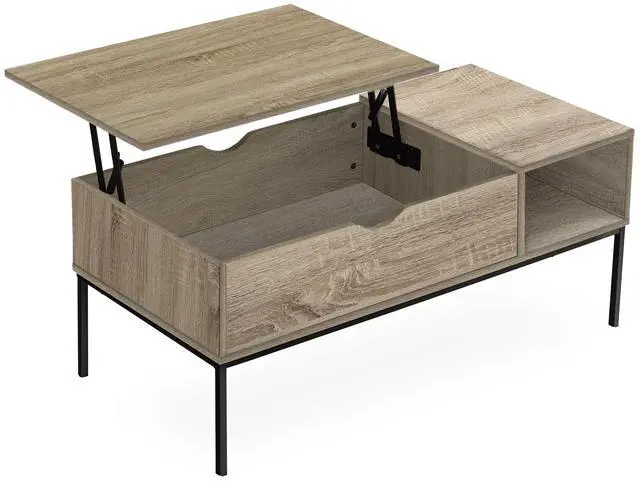 This contemporary style, 42" long rectangular coffee table with storage, a wood-look laminate dark taupe finish on all sides and a sleek black metal base will be a modern standout in your living space.