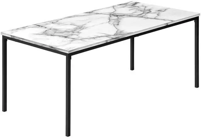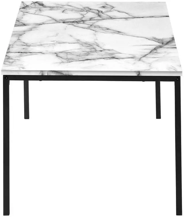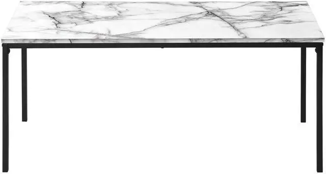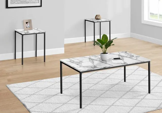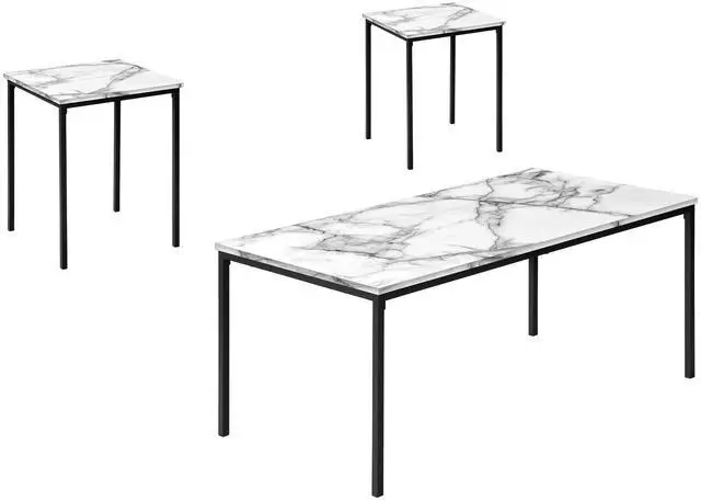 This fashionable 3-piece coffee table set features a contemporary design with white marble look laminate tops and sleek black metal frame.