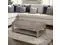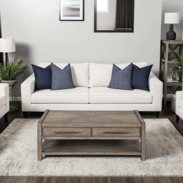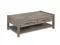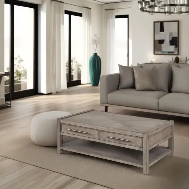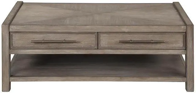 Dimensions: 50" wide x 30" deep x 18" high Made of Oak Solids and Veneers White Oak Finish Oversized Rubbed Bronze Hardware No Assembly Required Mitered wood grain top Unique mitered frame detail One shelf Two drawers